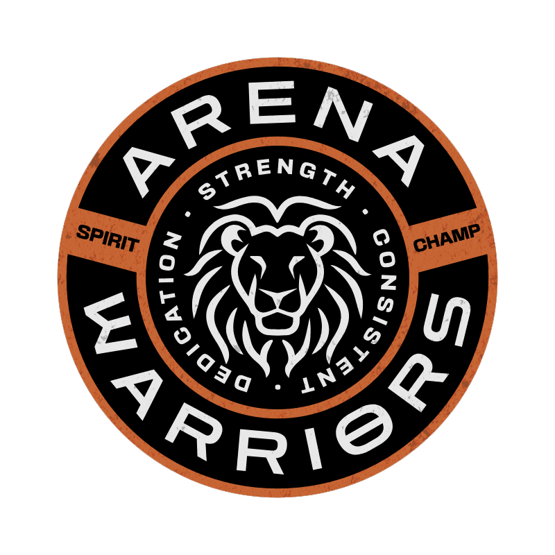 The Arena Warriors logo radiates power and resilience with a bold lion at its center, symbolizing leadership and courage. Surrounded by words like "Strength," "Consistency," and "Dedication," it emphasizes a champion’s mindset. The circular design with sharp typography reflects unity, spirit, and relentless drive—perfect for a team built to conquer.